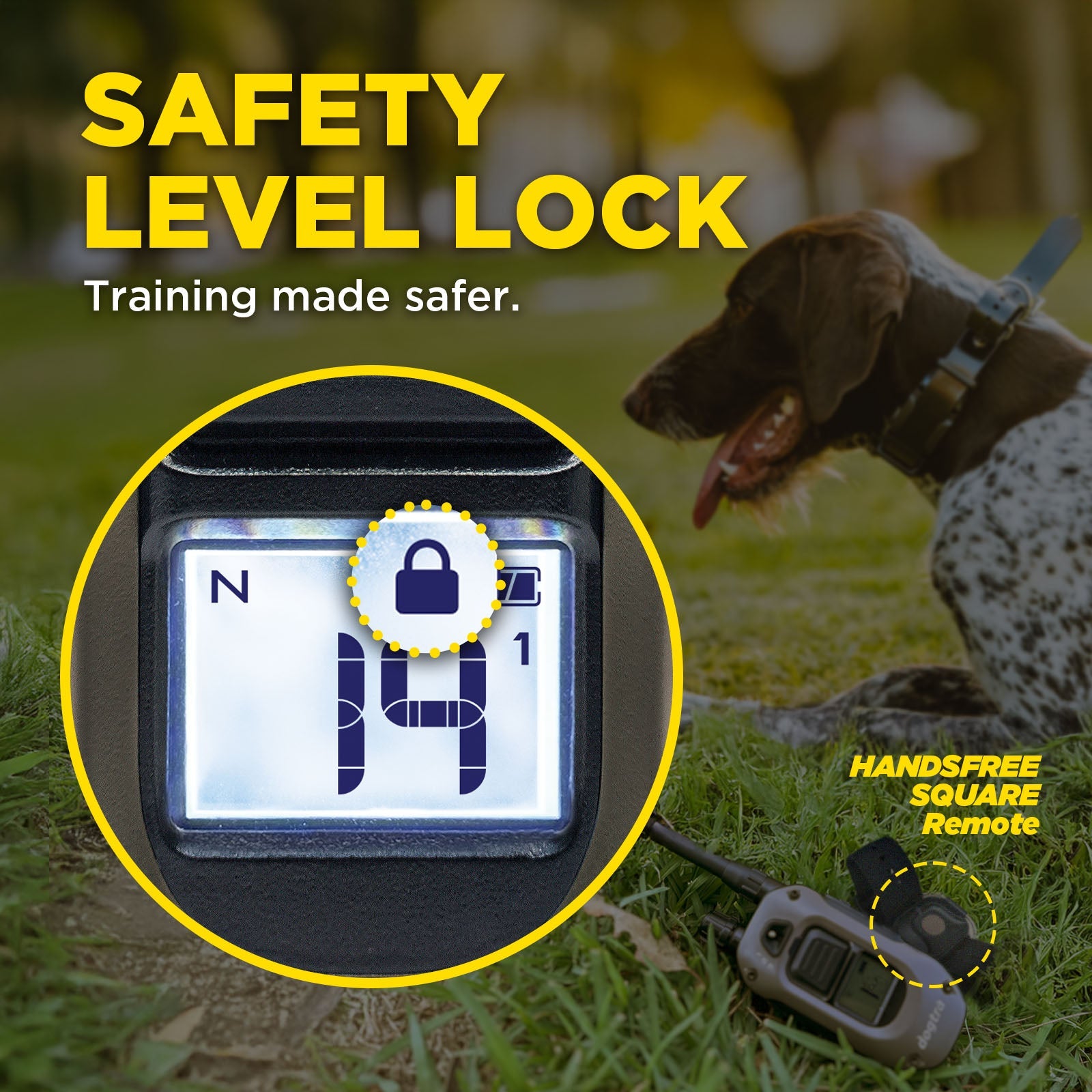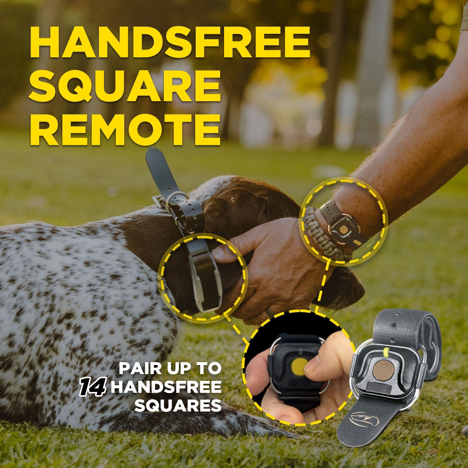 Meet 1900X Handsfree Remote Training System. Versatile Performance packed with a Handsfree Square lets you train without touching the remote. Pair up to 14 squares to any function - tone, light, stimulation, and each paired dog. Built for large dogs 35+ pounds with protective casing. 3/4-mile range, XPP vibration, LED visibility. IPX9K waterproof. Training, reimagined.